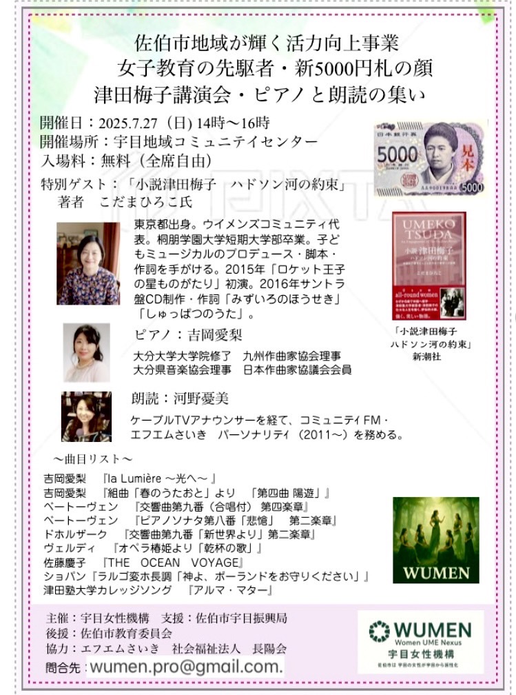 - 7/27(日)宇目女性機構 「津田梅子講演会・ピアノと朗読の集い」